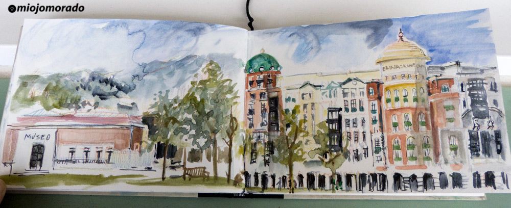 Después de permanecer bastante tiempo delante de la cafetería del Museo bajo techado, decidimos movernos a la plaza Euskadi para así cambiar de vista y aquí pintamos desde una cafetería recientemente inaugaurada, Sanwicoffee, que dispone de unos amplios ventanales que dan a la plaza y nos permitió dibujar cómodamente.